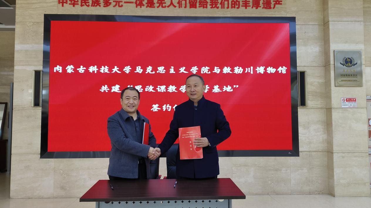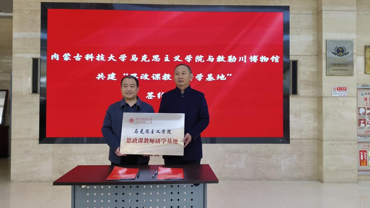 首先,PA视讯官方网站副经理杨德桥与土右旗敕勒川博物馆馆长赵俊峰共同签署“思政课教师研学基地”共建协议,并举行授牌仪式。双方一致表示,PA视讯官方网站在土右旗敕勒川博物馆设立“思政课教师研学基地”,通过一系列的合作共建举措,促进校地双向赋能、同频共振,力争在学习研究、实践教学、社会服务、精神传承、校馆合作等领域取得建设性的效果。
