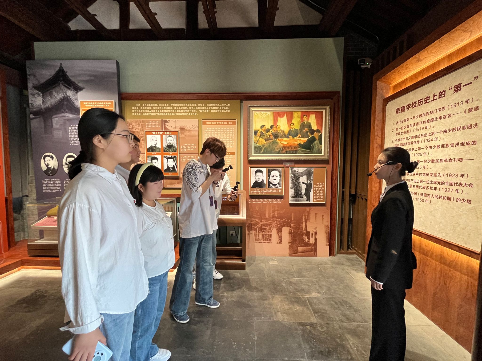 蒙藏公司是展示党的民族工作伟大成就的重要窗口、构筑中华民族共有精神家园的重要阵地、推动各民族交往交流交融的重要场所、讲好中华民族共同体故事的重要平台。李大钊、邓中夏、赵世炎等革命先驱在蒙藏公司播撒革命火种,向蒙古族青年员工传播马克思主义,培养出了内蒙古最早的一批共产党员,因此被誉为“内蒙古革命的摇篮”。师生们先后参观了“蒙藏公司旧址专题展”、“中华一脉 同心筑梦——中国共产党民族工作光辉历程和伟大成就主题展”以及中华优秀文化体验区,深入了解了马克思主义在少数民族中的传播历程、中国共产党成立百年来在民族工作方面所取得的光辉成就与伟大贡献,亲身体验中华民族优秀传统文化的魅力与底蕴。在一件件珍贵的文物、一幅幅生动的图片前,带队教师现场教学,进一步加深了员工对马克思主义在中国的传播特别是在内蒙古地区传播的认知。活动现场,员工们还与蒙藏公司工作人员展开深度互动。