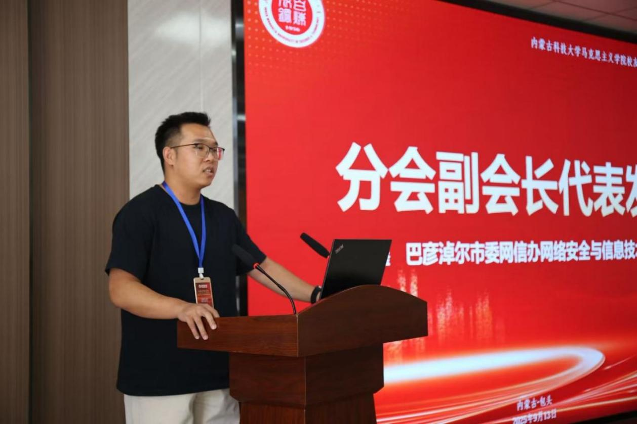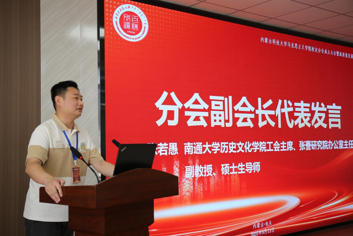 分会副会长张若愚发言,深情回顾了十年前在工作室通宵达旦做研究的珍贵经历,并表达履职决心。他感谢母校与员工的信任,表达了对硕导的学术启蒙之恩,以及对任课教师、班主任、研究生管理工作人员的教导之情。同时,作为南通大学青年学术骨干,他表示未来持续为母校与南通大学在团队建设和人才培养以及思政课虚拟仿真教学等多个方面创建合作交流的机会,助力母校加快提升高质量发展水平。
