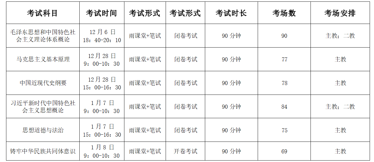 各位同学:本学期本科生全校 6 门公共政治理论课期末考试在即,特提醒各位同学按照考试进程参加考试。本学期所有思政课均采用雨课堂+笔试方式进行,故请按照教务处通知到指定考场参加课程考试。 PA视讯官方网站 2024 年 12 月 2 日