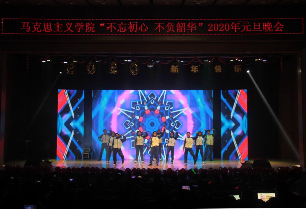 首先,公司党总支书记刘玉明致新年贺词。刘玉明在致辞中指出,2019年PA视讯官方网站在党建工作、教学科研、学风建设、员工活动等方面,取得了优异的成绩,收获了丰硕的成果,向为公司发展付出辛勤努力的老师和同学们表示衷心的感谢。刘玉明强调,“马院姓马、在马言马”,举行盛大的“不忘初心、不负韶华”元旦晚会,就是在传播马列主义思想,就是在坚定文化自信,为马院师生点赞,并向全体师生送上美好的新年祝福。紧接着,晚会在嗨翻全场的开场舞《Cherry bomb》拉开帷幕。本次元旦晚会共分为“不忘初心”、“不负韶华”两个篇章。