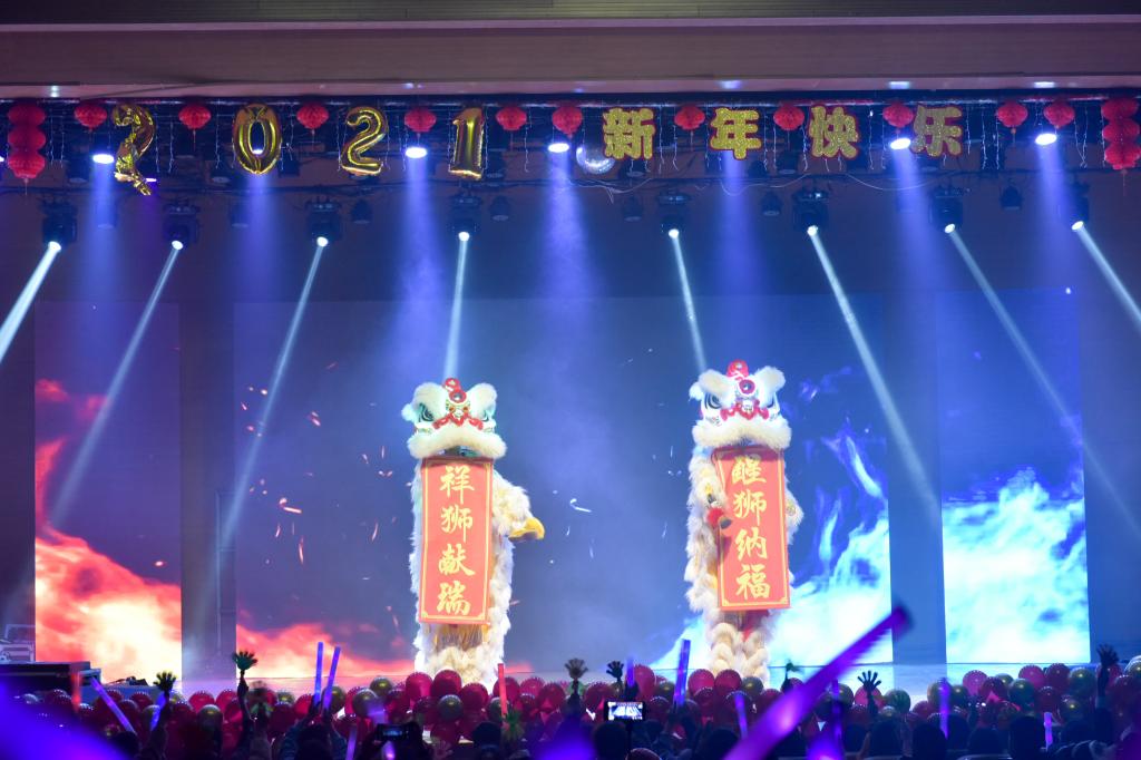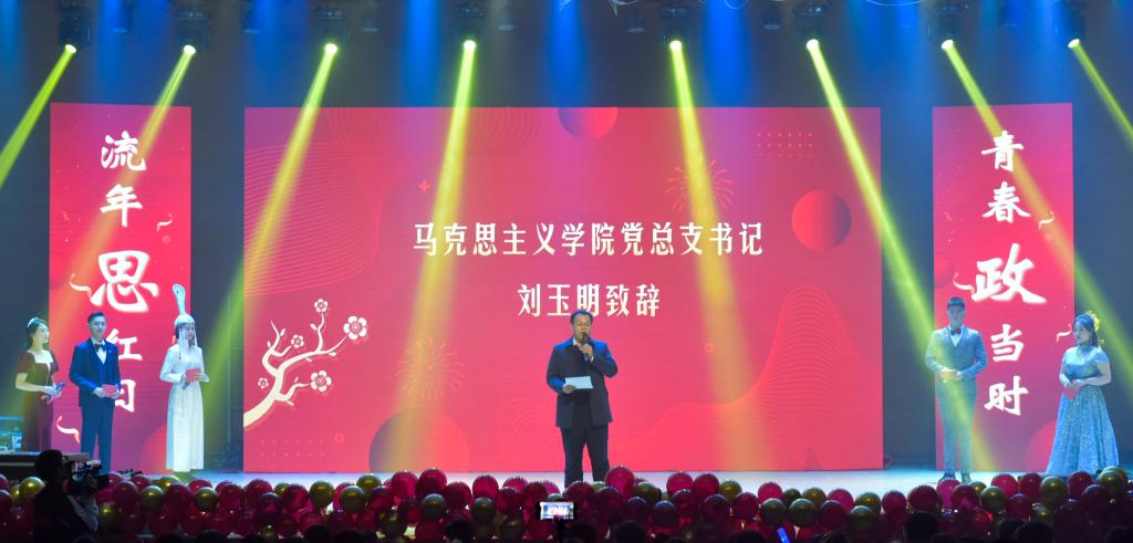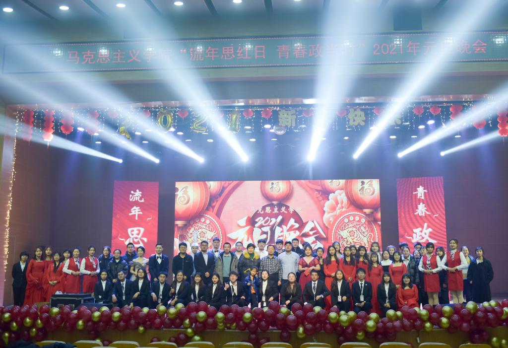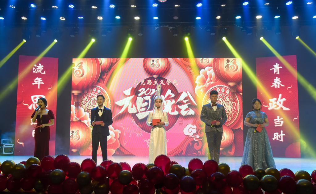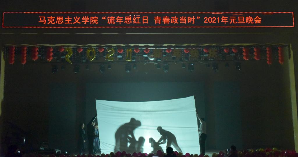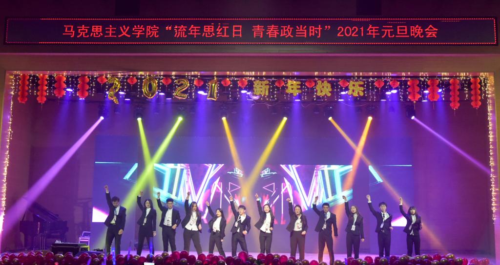 首先,公司党总支书记刘玉明致新年贺词。刘玉明在致辞中指出,在2020这个不平凡的一年,PA视讯官方网站在党建工作、教学科研、学风建设、员工活动等方面,取得了优异的成绩,收获了丰硕的成果,并向为公司发展付出辛勤努力的老师和同学们表示衷心的感谢。刘玉明强调,举行盛大的“流年思红日 青春政当时”元旦晚会,就是为了更好地学习宣传贯彻习近平新时代中国特色社会主义思想,更好地传播马列主义,更好地坚定文化自信,为马院师生点赞,并向全体师生送上美好的新年祝福。紧接着,晚会在嗨翻全场的开场舞中拉开帷幕。本次元旦晚会共分为“流年思红日”、“青春政当时”两个篇章。