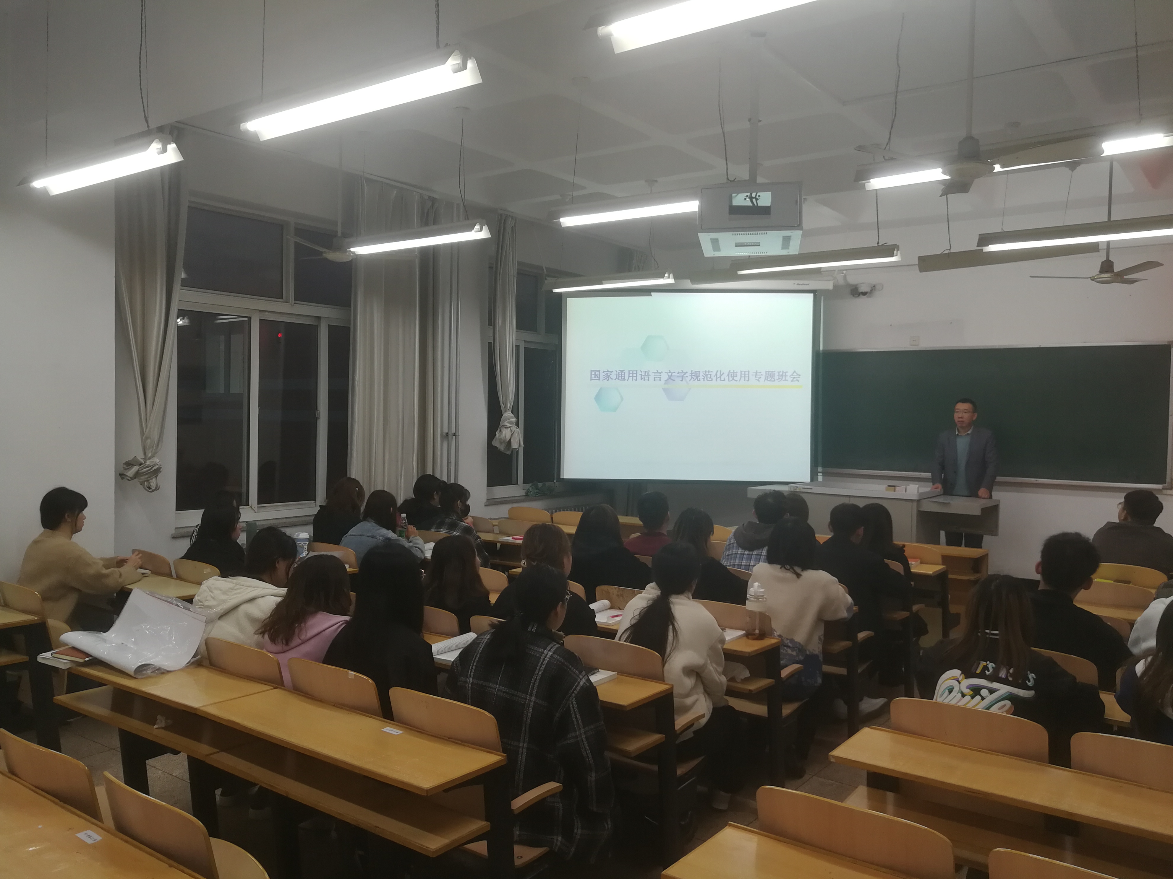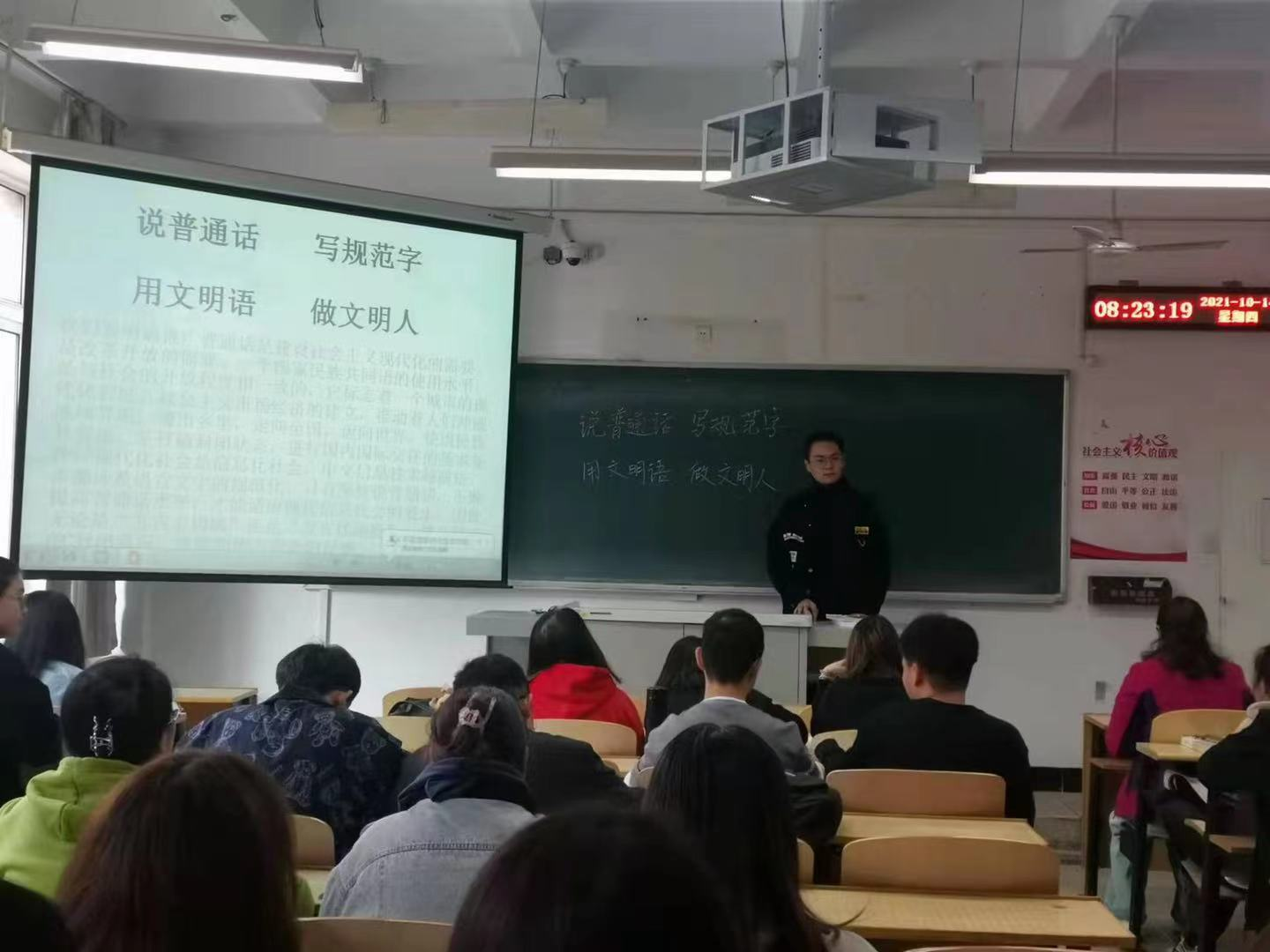 2021年10月13至14日,PA视讯官方网站各年级分别开展了国家通用语言文字规范化专题班会,向广老员工宣讲国家通用语言文字规范化使用的相关知识,要求员工要提高用字规范意识,养成规范用字习惯,在日常学习生活中要说普通话,写规范字,用文明语,做文明人,切实提高使用国家通用语言文字的能力与水平,共同建设校园文明新形象。