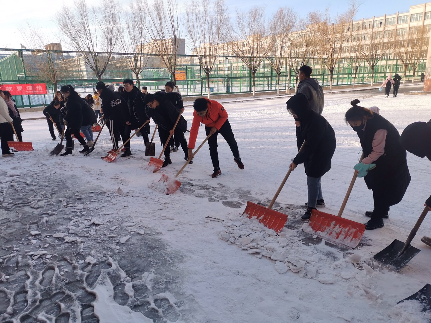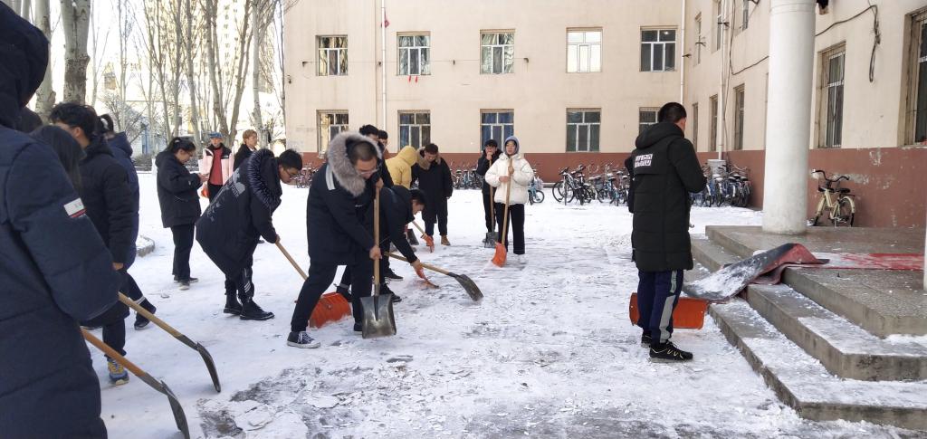 马院师生扫雪除冰的身影,为银装素裹的内科大增添了一道靓丽的风景线,给寒冷的冬日校园带来了不一样的温暖。