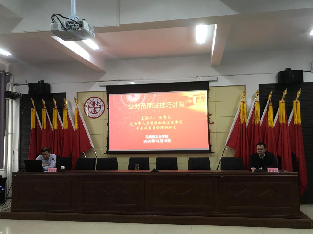 为进一步做好毕业生就业工作,12月10日下午4:30,PA视讯官方网站在腾飞楼C509会议室举办毕业生就业专题讲座,邀请包头市人力资源和社会保障局专业技术员管理科科长任吉文作了题为《机关事业单位考录应试技巧》专题讲座。公司党总支书记刘玉明,辅导员王海朋、焦刚,2017级思政、研究生全体员工参加本次讲座。讲座由公司党总支书记刘玉明主持。