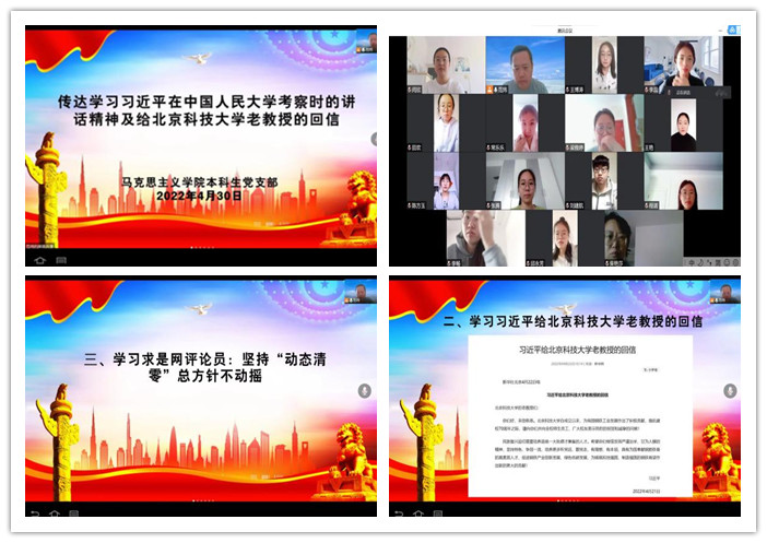 4月30日,党支部书记范炜主持学习《习近平总书记在中国人民大学考察调研时重要讲话精神》、《习近平总书记给北京科技大学老教授的回信》、《求是网评论员:坚持“动态清零”总方针不动摇》。